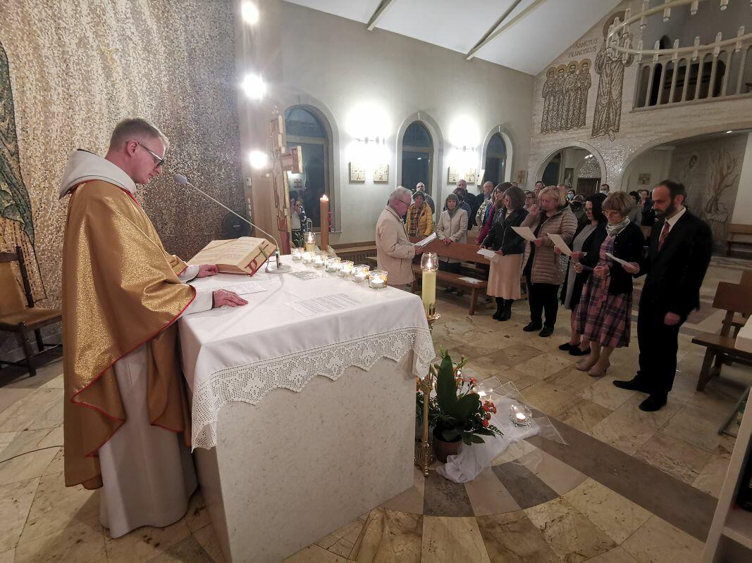 O godzinie 22 rozpoczęła się uroczysta Msza święta, podczas której, wzywając łaski Ducha Świętego, wstawiennictwa Najświętszej Maryi Dziewicy i świętego Ojca naszego Franciszka, na ręce brata Mariana i ojca Leona przyrzeczenia życia ewangelicznego złożyli: siostra Agnieszka oraz małżonkowie siostra Iwona i brat Paweł - profesję wieczystą, a siostra Iwona i siostra Wanda - profesję czasową. Później nastąpiło także przyjęcie do nowicjatu siostry Izy, siostry Jadwigi oraz małżonków siostry Bożeny i brata Roberta, a ponadto przyjęcie do postulatu siostry Wiktorii.