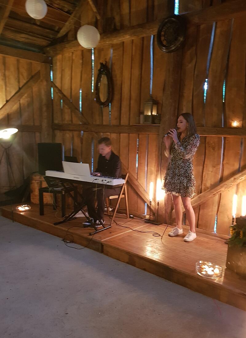 Stodoła Jazzowa stała się na ten wieczór domeną szlachetnego słowa i pięknej muzyki. Koncertowi młodych artsytów - wokalistki Barbary Błaszczyk i wirtuoza instrumentów klawiszowych Michała Jakubczaka towarzyszyła nastrojowa oprawa wizualna, a całość podziwiała wyjątkowo licznie zgromadzona widownia. Przy pięknie ozdobionych stołach oraz na starych, wiejskich ławach, a także przyniesionych krzesłach zasiadło z górą setka osób.