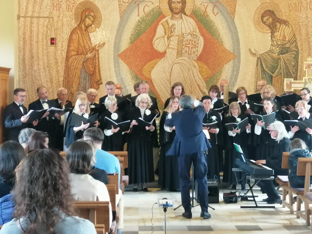 Niedzielnym, prześlicznym popołudniem, 8 maja 2022 po mszy świętej o 15 nasza franciszkańska świątynia wypełniła się muzyką klasyczną. Zabrzmiało oratorium sacrum Mesjasz Georga Friedricha Haendla wykonane przez solistów i chór Komorowskiego Towarzystwa Śpiewaczego. Zespołowi towarzyszyła Danuta Kojro, grająca na naszych nowych holenderskich organach i instrumencie klawiszowym. Pani Danuta jest na co dzień najwyższej klasy muzykiem znanej polskiej orkiestry barokowej Concerto Avenna oraz zespołu Filharmonii Narodowej. Słowo wstępne oraz zapowiedzi poszczególnych części dzieła wraz z polskim tłumaczeniem oryginalnych, angielskich tekstów wygłosił profesor Jeremi Królikowski. Całość przygotował i poprowadził od pulpitu dyrygenckiego profesor Witold Błaszczyk. Od przeszło ćwierć wieku jest On profesorem Instytutu Kształcenia Organistów, kierował też tą placówką wraz z księdzem Andrzejem Filaberem, wykłada dyrygenturę i grę na organach oraz teorię muzyki. Jest nadto od lat 80 XX wieku koncertującym organistą i klawesynistą, który występował w całym kraju i wielu krajach Europy. Jako organista grał na mszy świętej, której przewodniczył Jan Paweł II na Pl. Piłsudskiego w Warszawie. W 2016 został współzałożycielem Komorowskiego Towarzystwa Śpiewaczego i jest pełnym energii i pomysłów kierownikiem zespołu. Zespół ma swym repertuarze sześć różnych programów, między innymi koncert papieski, Moniuszkowski oraz zatytułowany Polska siedmiu wieków. Ciekawy jest skład chóru złożony z osób różnej profesji i wieku a nawet narodowości, których łączy miejsce zamieszkania – Komorów oraz naturalnie miłość do muzyki. Wśród członków chóru są na przykład: dentysta, austriacki biznesmen, ekonomista, geolog, lingwistka oraz żona amerykańskiego dyplomaty. Właśnie ta ostatnia Katharina LaBanca była jedną z solistek koncertu. Równie pięknie, jak pani LaBanca zaprezentowali swe umiejętności śpiewacze pozostali soliści Katarzyna Przywecka, Marcin Pilich i Michał Muzyka. Na koncert w gościnne progi kaplicy przybyła liczna grupa wielbicieli Haendla, a także tych, którzy chcieli usłyszeć jak brzmią nowe organy zakupione przez Ojca Leona. Nie zawiedli się bo i znakomity instrument i głosy solistów oraz chóru sprawiły, że oratorium Mesjasz ukazało swą głębię, a treść dzieła dotycząca Męki i Zmartwychwstania Jezusa Chrystusa zajaśniała godnym blaskiem. Witold Błaszczyk z właściwym sobie entuzjazmem i wielką energią poprowadził koncert, który dzięki temu stał się również rodzajem widowiska i pokazem kunsztu wykonawców. Bezpośrednio po koncercie artyści odpoczywali w Cafe Francesco, korzystając z pięknej pogody odbyli też spacer nad Świder. Następnie cały zespół udał się do centrum Warszawy, gdzie ponownie prezentował Haendlowskiego Mesjasza w kościele pod wezwaniem Najświętszego Zbawiciela.