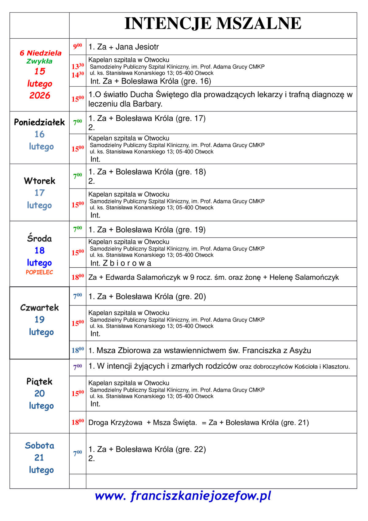 Ogłoszenia na niedzielę oraz intencje mszalne na cały tydzień