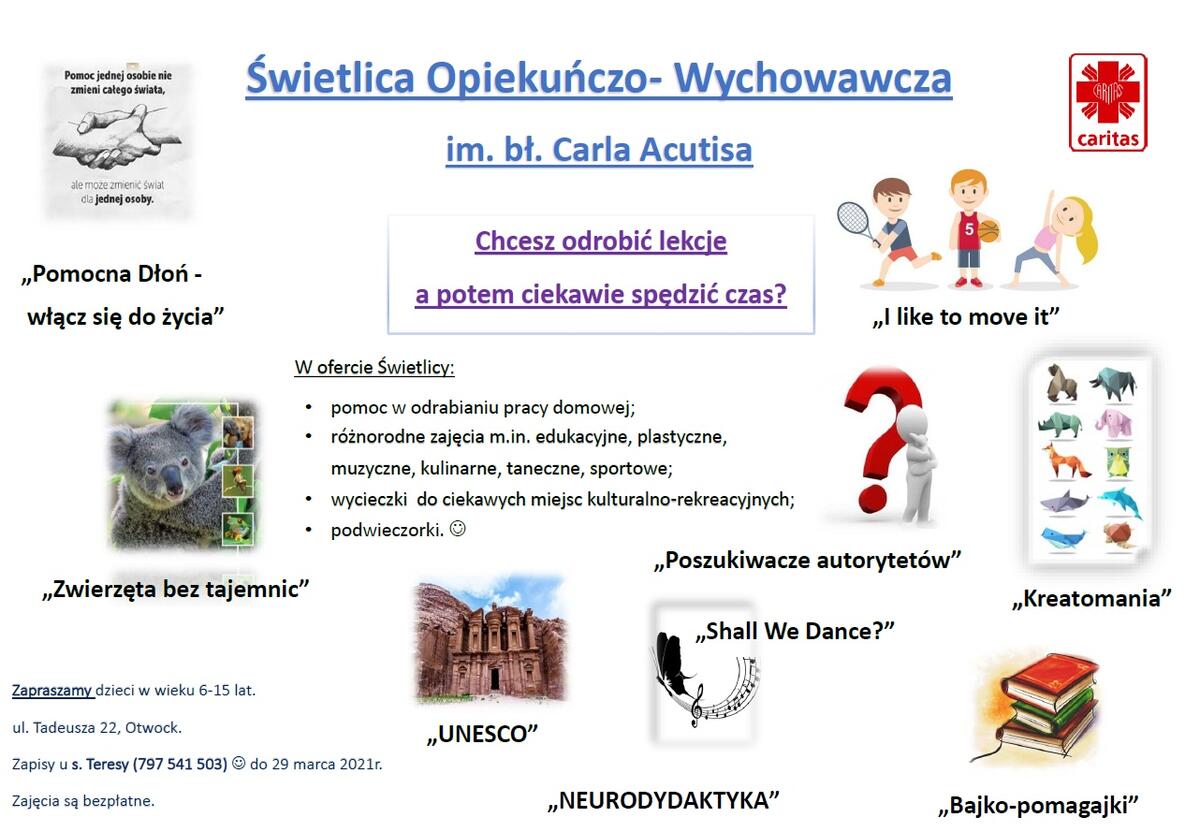 Siostry Albertynki zapraszają rodziców, którzy byliby zainteresowani zajęciami dla dzieci prowadzonymi w świetlicy przy ul. Tadeusza 22 w godzinach popołudniowych (od 14.00-18.00), 3 razy w tygodniu (od wtorku do czwartku).